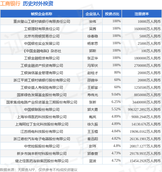 本站消息,根据天眼查APP显示速配资,工商银行(601398.SH)新增一起对外投资事件,被投资公司为中创智领(郑州)工业技术集团股份有限公司,法定代表人焦承尧,投资占比为1.46%。该公司从事专用设备制造业,注册资本为178539.993万人民币。目前速配资,工商银行共存在对外投资1524项,投资占比前20的项目见下表: