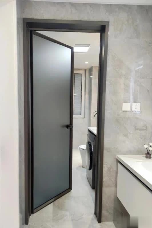 正确做法:一定要选玻璃平开门,门套选极窄4公分的,边框也要选极窄边框,壁厚要达到2.0以上,玻璃颜色选择月光灰,对比黑色,不仅好看而且更百搭。