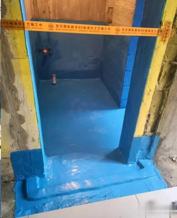 注意:刷之前基层一定要处理平整,打扫干净,使防水涂料更好的附着在地面上,门口做挡水坝,防止水溢出。